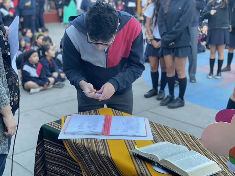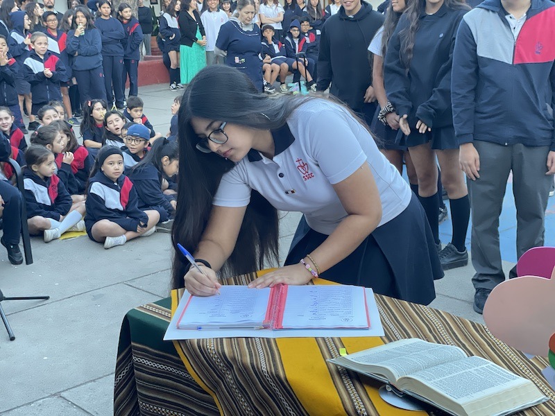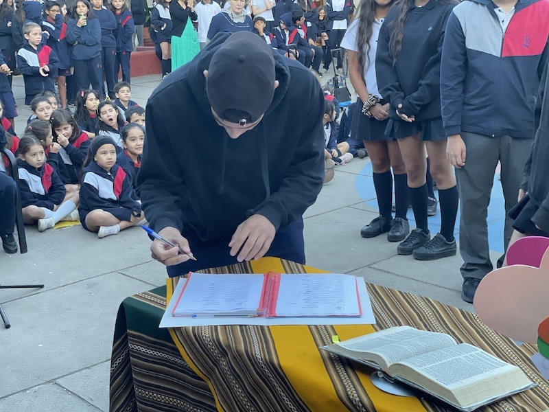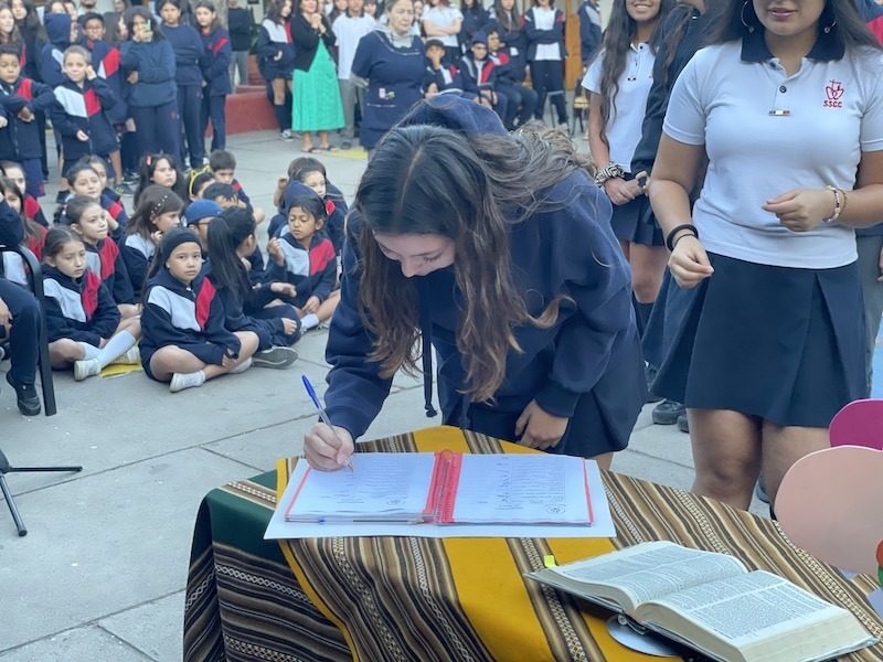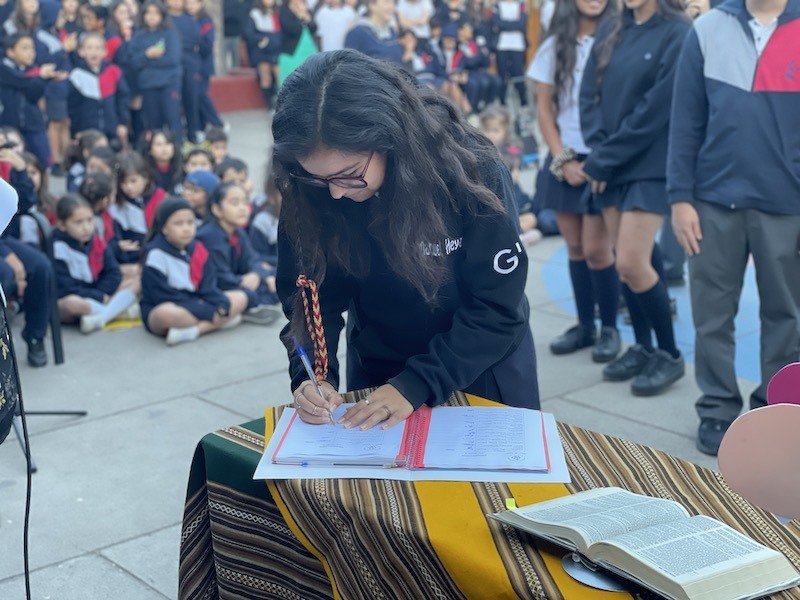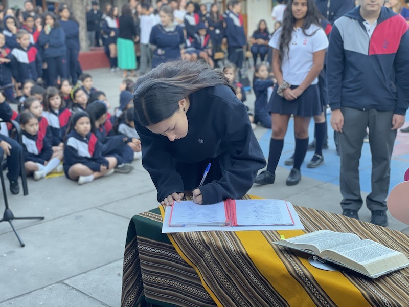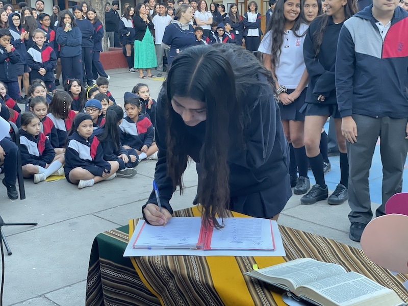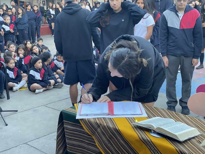 Luego de responder “Si, estoy dispuesto/a” a las preguntas sobre su disponibilidad para realizar esta labor y encarnar los valores del colegio, las y los brigadieres firmaron su compromiso delante de todo el colegio.