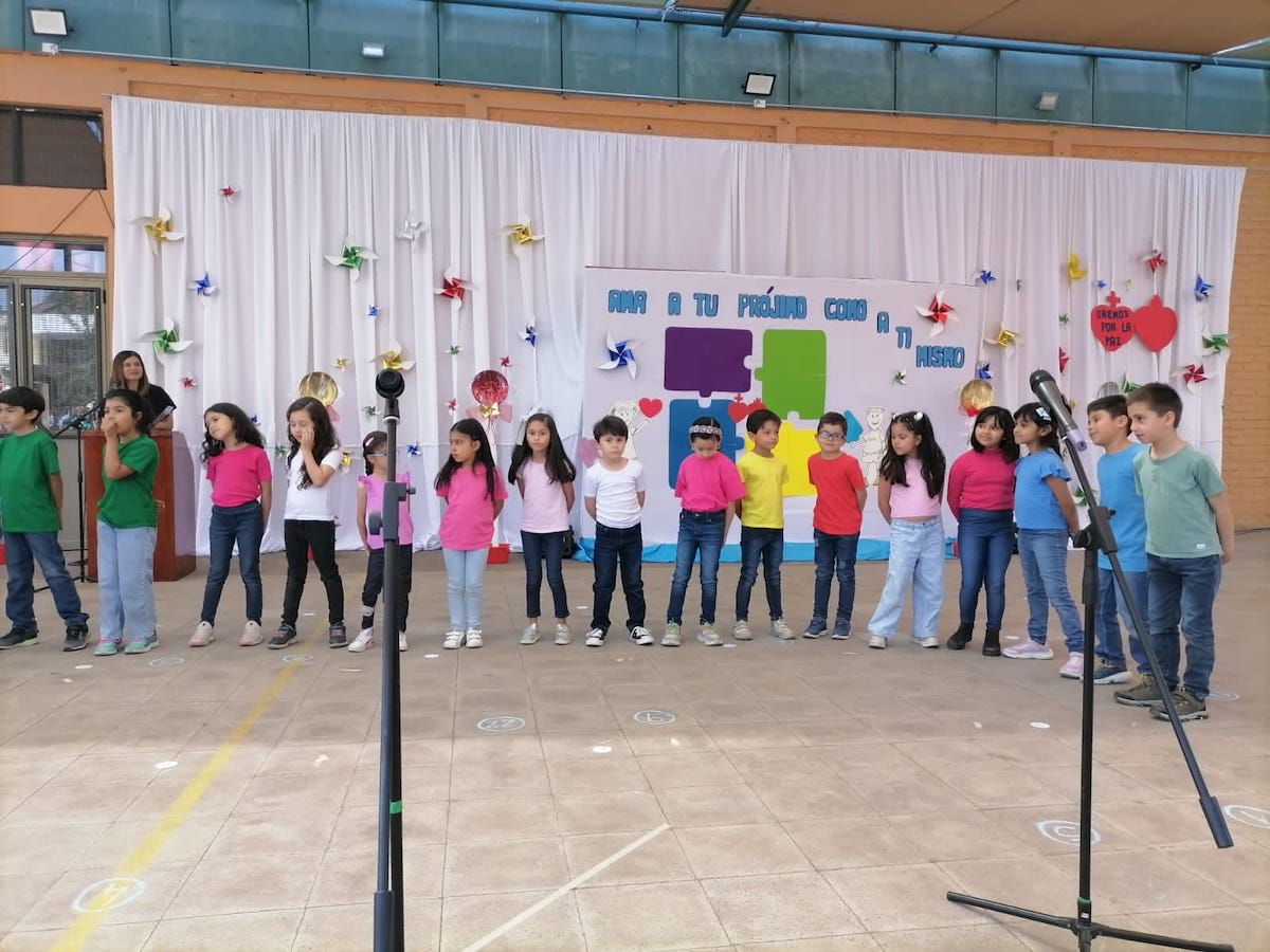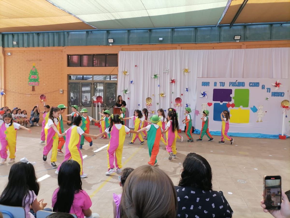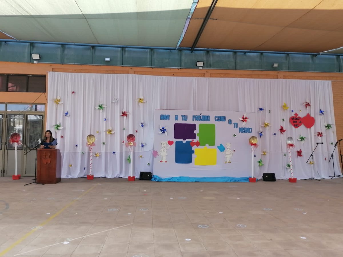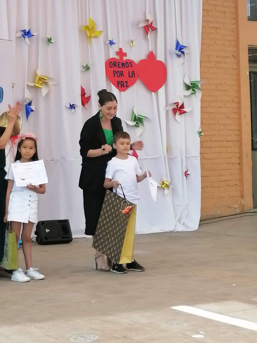 Por ello, en los actos de cierre del año escolar, nuestros apoderados pudieron disfrutar de bailes y cantos realizados por nuestros estudiantes que apuntaban a este valor, y también se reconocieron sus esfuerzos y éxitos en los ámbitos académico, deportivo y valórico. Nuestros estudiantes de cuarto básico y octavo básico, que demostraron su adhesión a los valores de nuestra Congregación, recibieron la medalla Padre Damián y Virgen de la Paz, respectivamente.