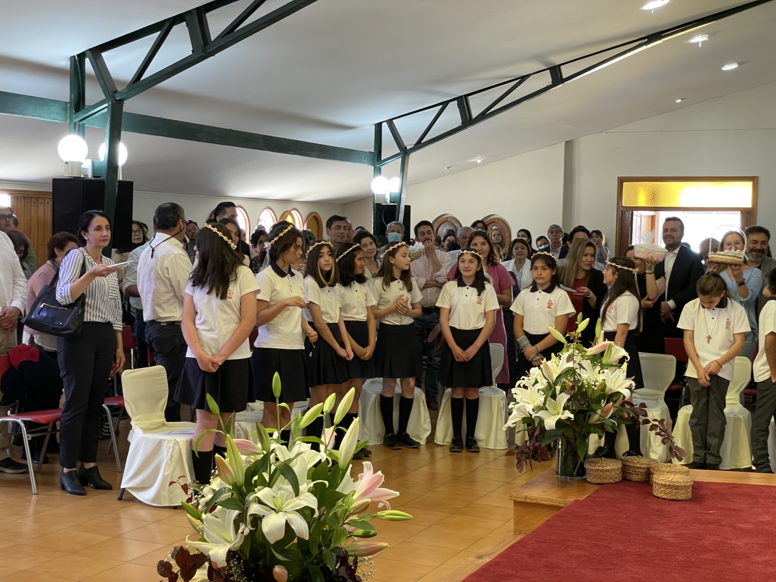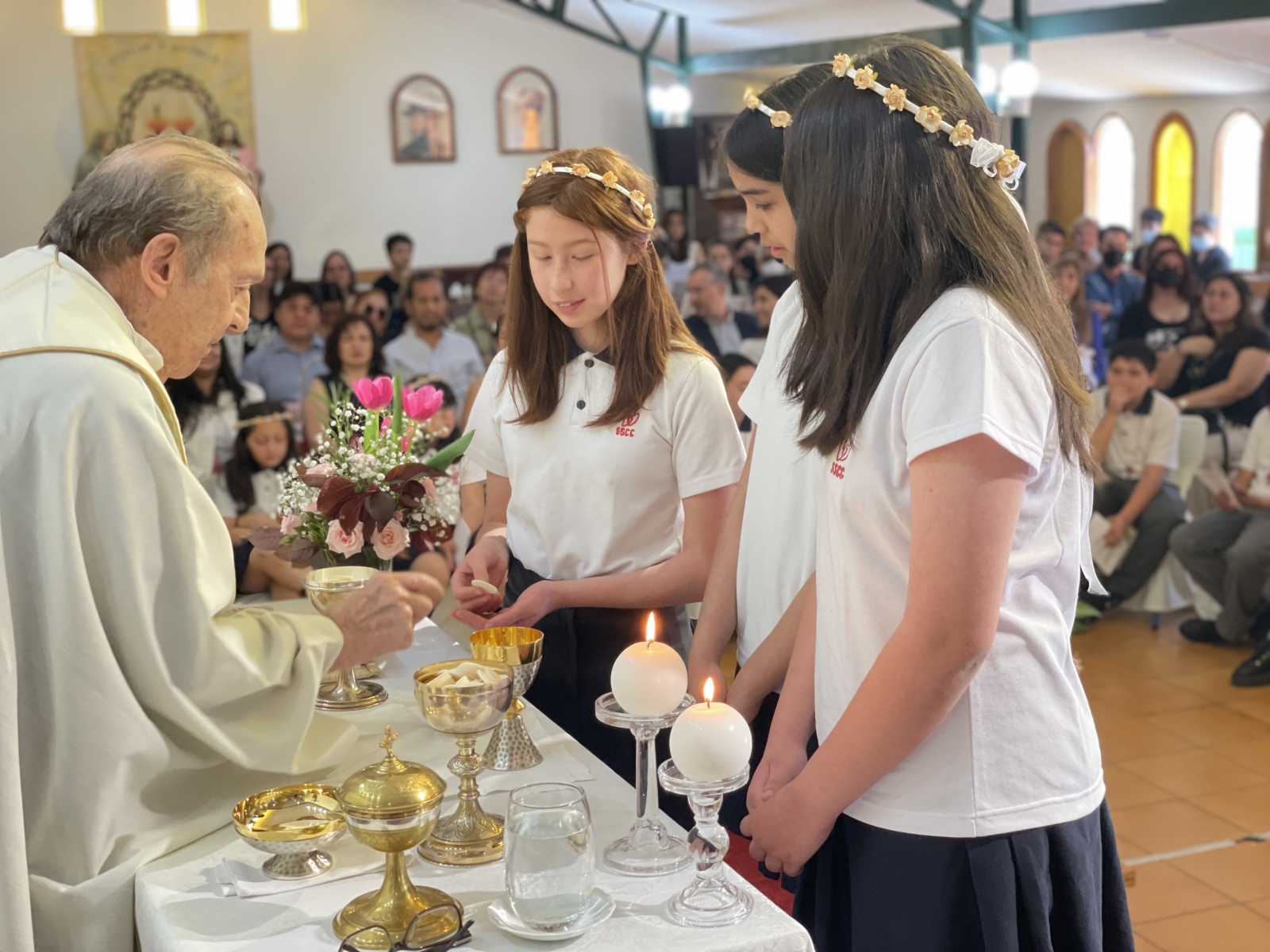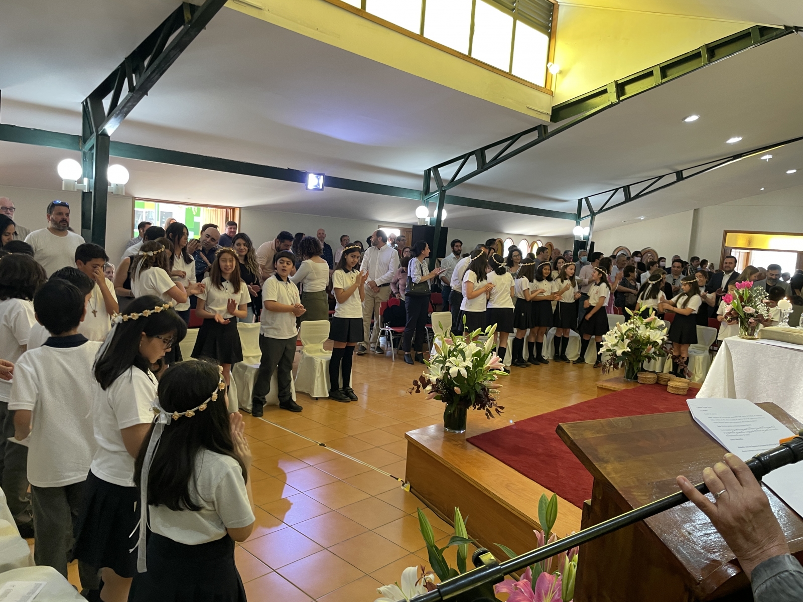 Durante dos domingos, en la misa comunitaria, nuestras niñas y niños de quinto básico estarán recibiendo su primera comunión. Ayer domingo 16 de octubre fue el momento del quinto básico A, más dos estudiantes de sexto básico que se sumaron a estar hermosa acción de gracias.