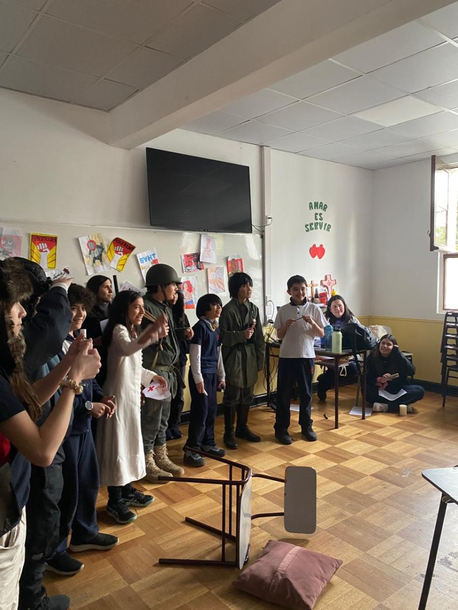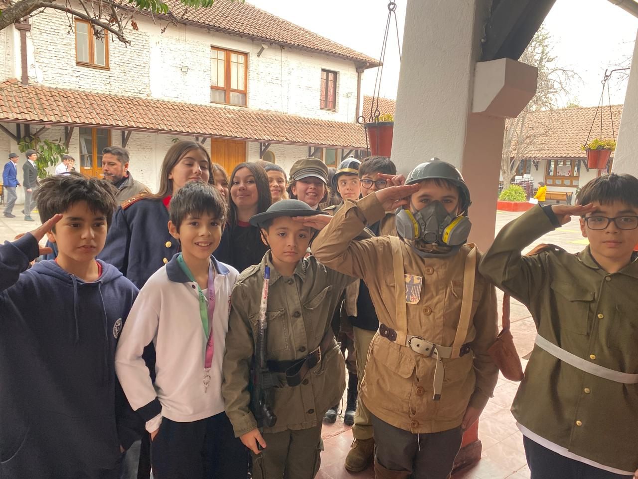 El jueves 18 de julio se realizó una nueva versión del Día de la Historia. Este año se conmemoran los 110 años del inicio de la Primera Guerra Mundial (1914-1918) y por ello se invitó a nuestros estudiantes a conocer y reflexionar sobre este proceso histórico, que implicó tantos cambios en la humanidad y que nos hace pensar en nuestra propia realidad mundial actual y la necesidad de buscar resoluciones pacíficas a los conflictos. La jornada se inició a las 11.45 hrs. en el patio de la capilla, con la presencia de todos los cursos del colegio y de dos invitados del Museo Histórico Militar; la encargada de las actividades pedagógicas y el coordinador de actividades. Luego del paseo de la bandera nacional y el estandarte del colegio, Clyo, la musa de la Historia, invitó a los presentes a reflexionar sobre los antecedentes de este conflicto bélico, entrevistando a los países de la Triple Alianza y la Triple Entente, a Nacionalismo e Imperialismo, a un joven que iba apurado a enlistarse, al archiduque Francisco Fernando, heredero al trono del Imperio Austro-Húngaro y su esposa Sofía, al líder de la Mano Negra y a Gavrilo Princip, quien sería el asesino del archiduque y su esposa, hecho que causaría finalmente el inicio de la guerra. Los estudiantes observaron atentos toda esta presentación.