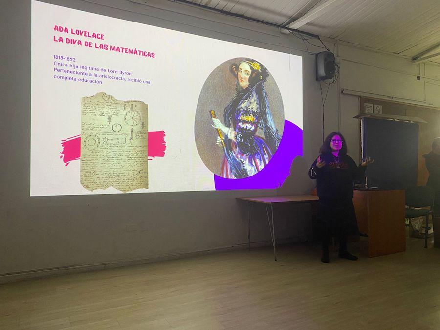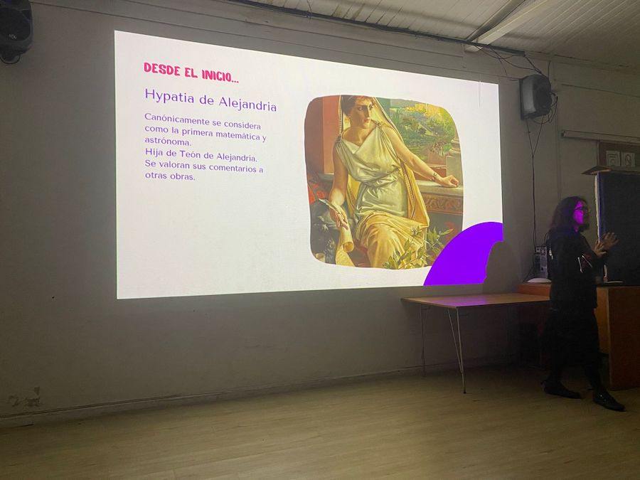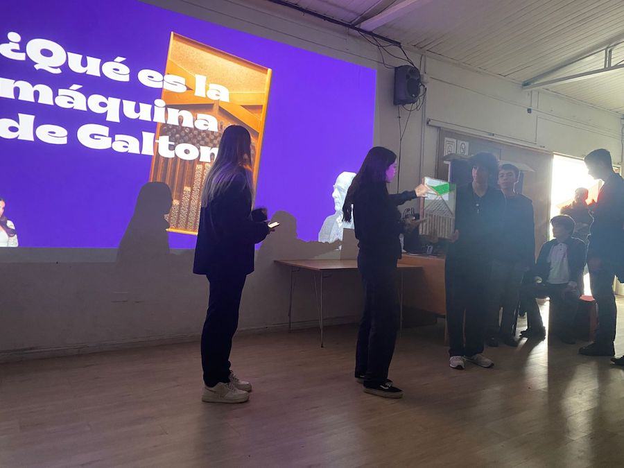 Mientras tanto, los estudiantes de 7º a IV medio, disfrutaron de dos exposiciones preparadas por estudiantes de III y IV medio; Sofía Isla (IV medio) realizó una excelente presentación acerca de las mujeres en la matemática, desde Hypatia de Alejandría, hasta las recientes ganadoras del premio Medalla Fields, para descubrimientos sobresalientes en esta área, como Maryam Mirzajani. Todos quedaron muy bien informados y Sofía recibió una ovación por su pasión y conocimiento sobre esta materia. Luego, varios estudiantes de III medio, presentaron la Máquina de Galton y explicaron más acerca de su origen y aplicaciones prácticas, las cuales mostraron al hacer participar al público presente.