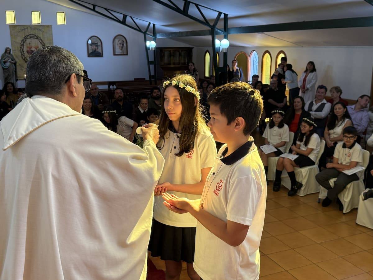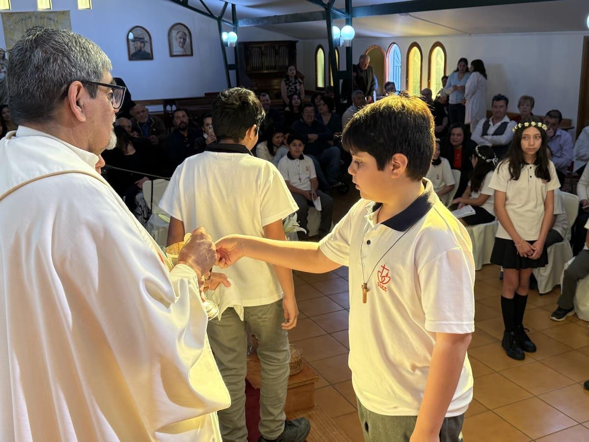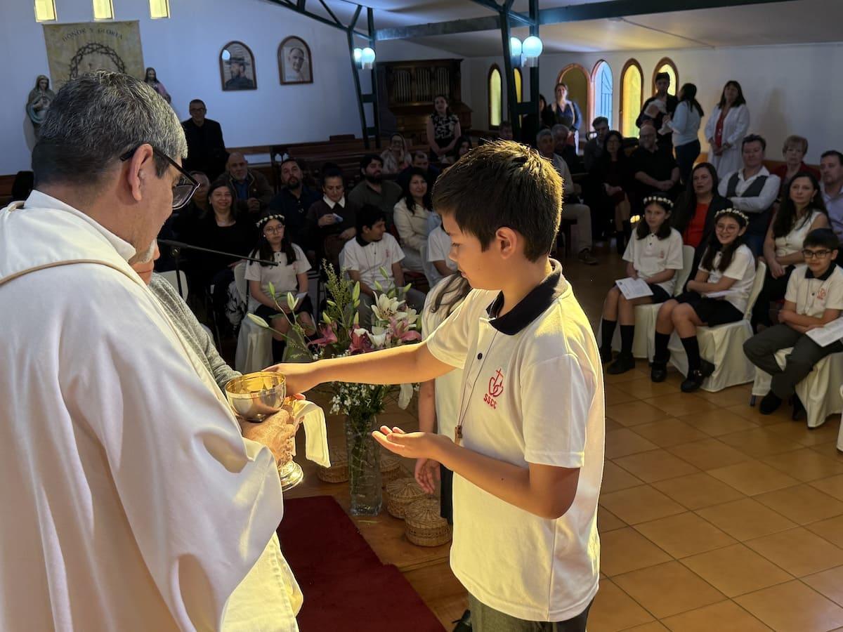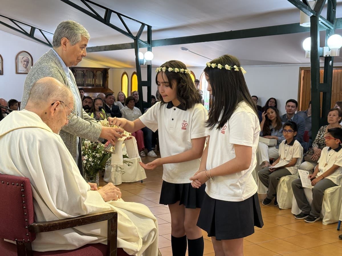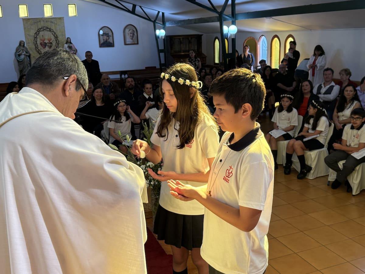 El sábado en la tarde fue el turno del 5º básico A y el domingo a las 9 de la mañana del 5º básico B. Ambas fueron presididas por el hermano Mario Soto ss.cc. quien mantuvo entusiasmados a los pequeños haciéndoles preguntas y conversando lo que significa la oración y el amor de Jesús en sus vidas.