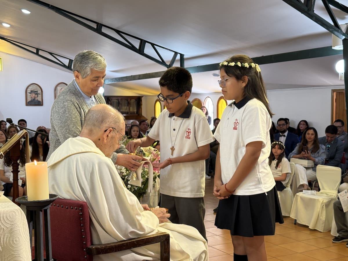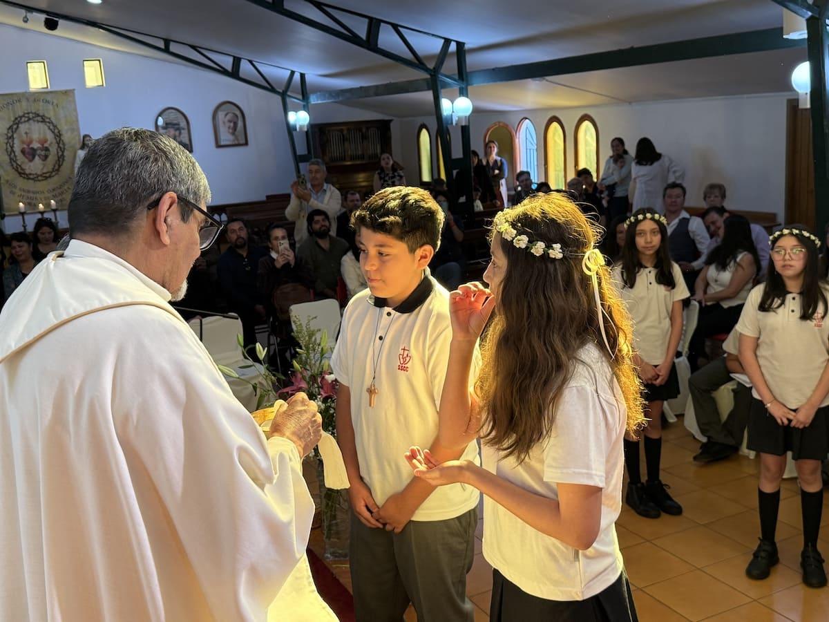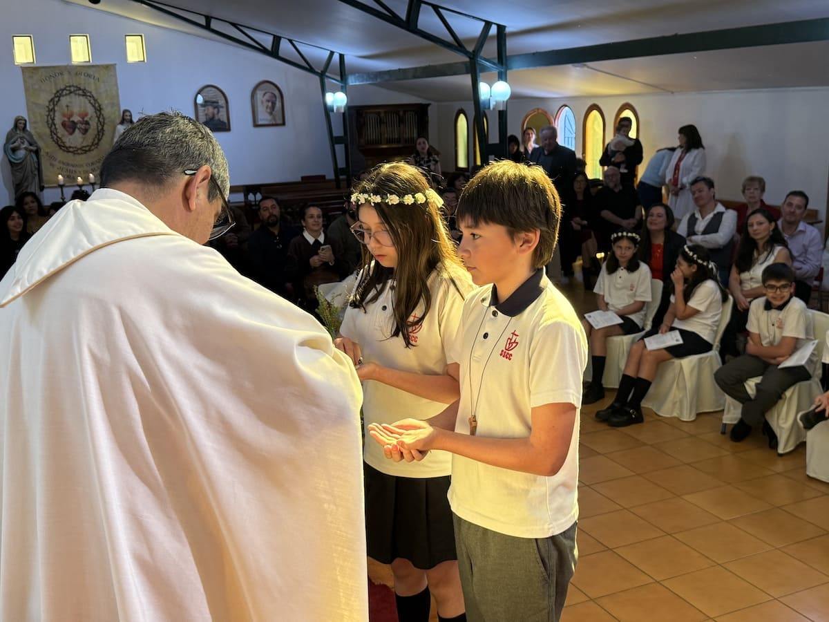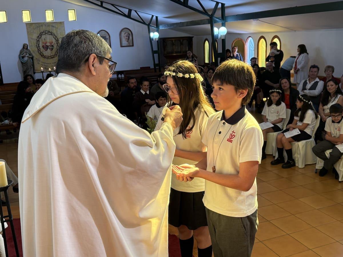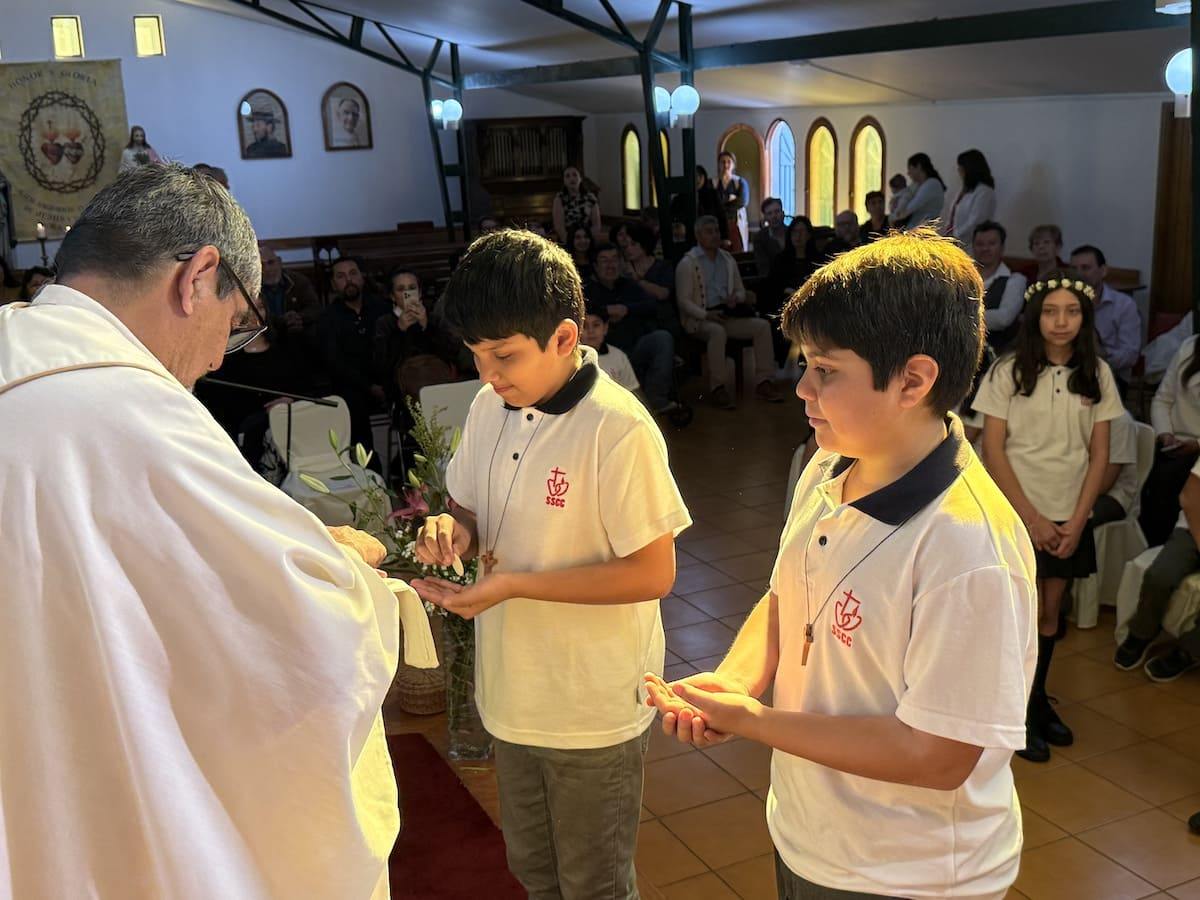 El sábado en la tarde fue el turno del 5º básico A y el domingo a las 9 de la mañana del 5º básico B. Ambas fueron presididas por el hermano Mario Soto ss.cc. quien mantuvo entusiasmados a los pequeños haciéndoles preguntas y conversando lo que significa la oración y el amor de Jesús en sus vidas.