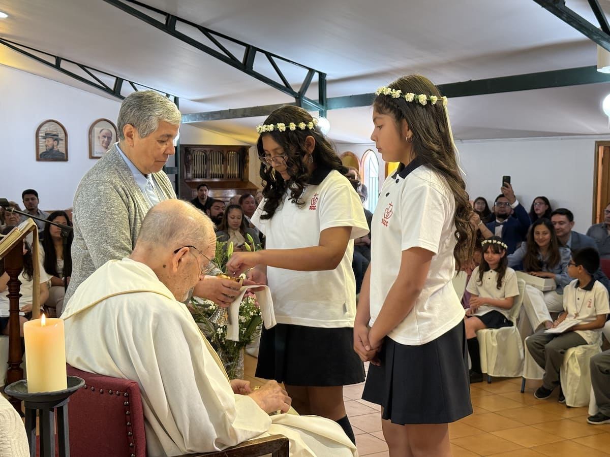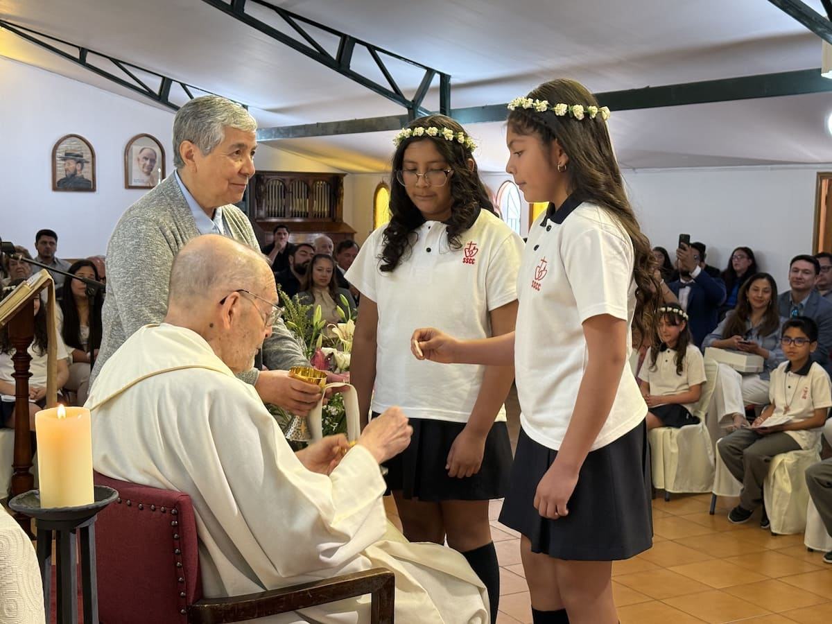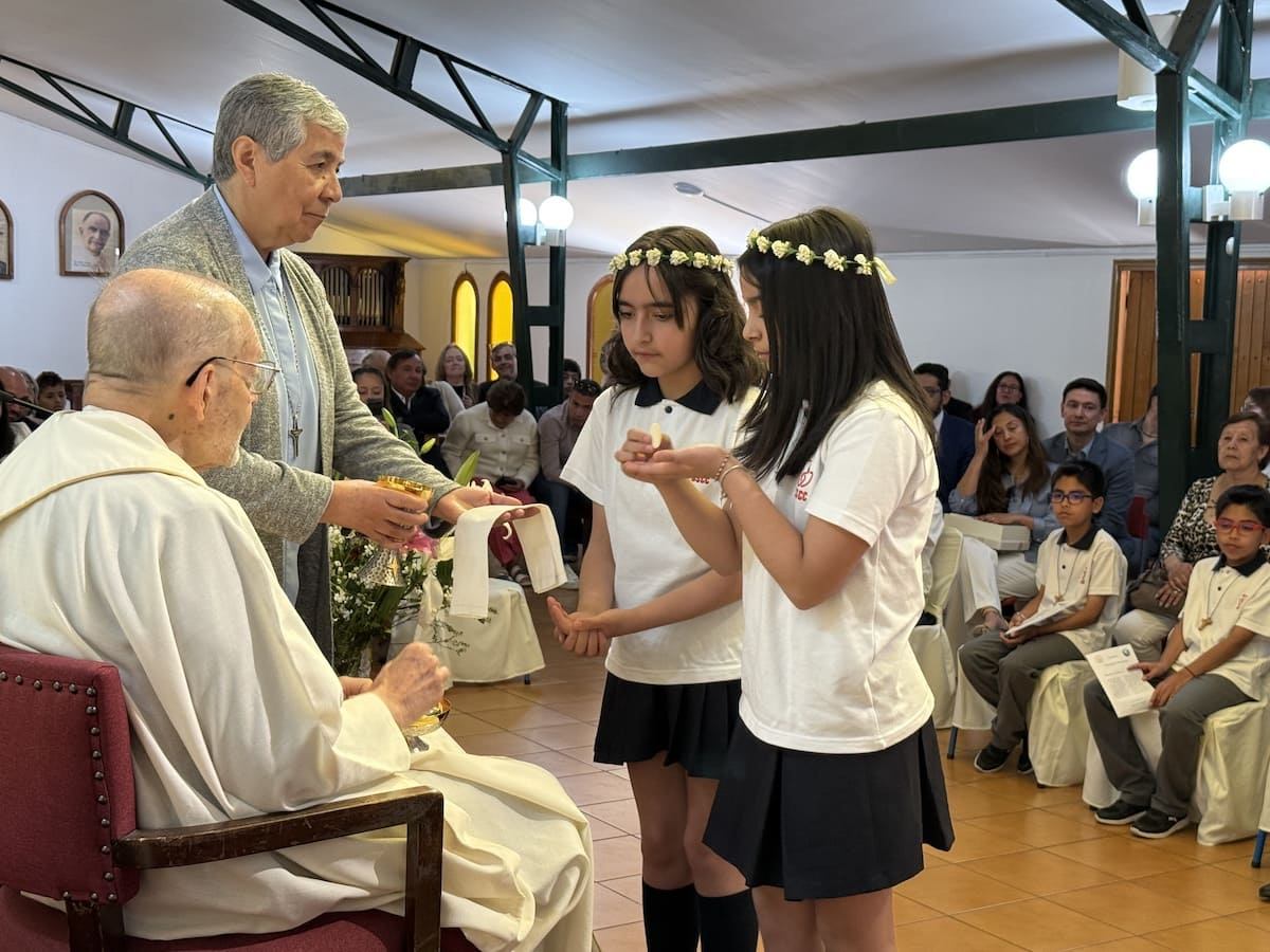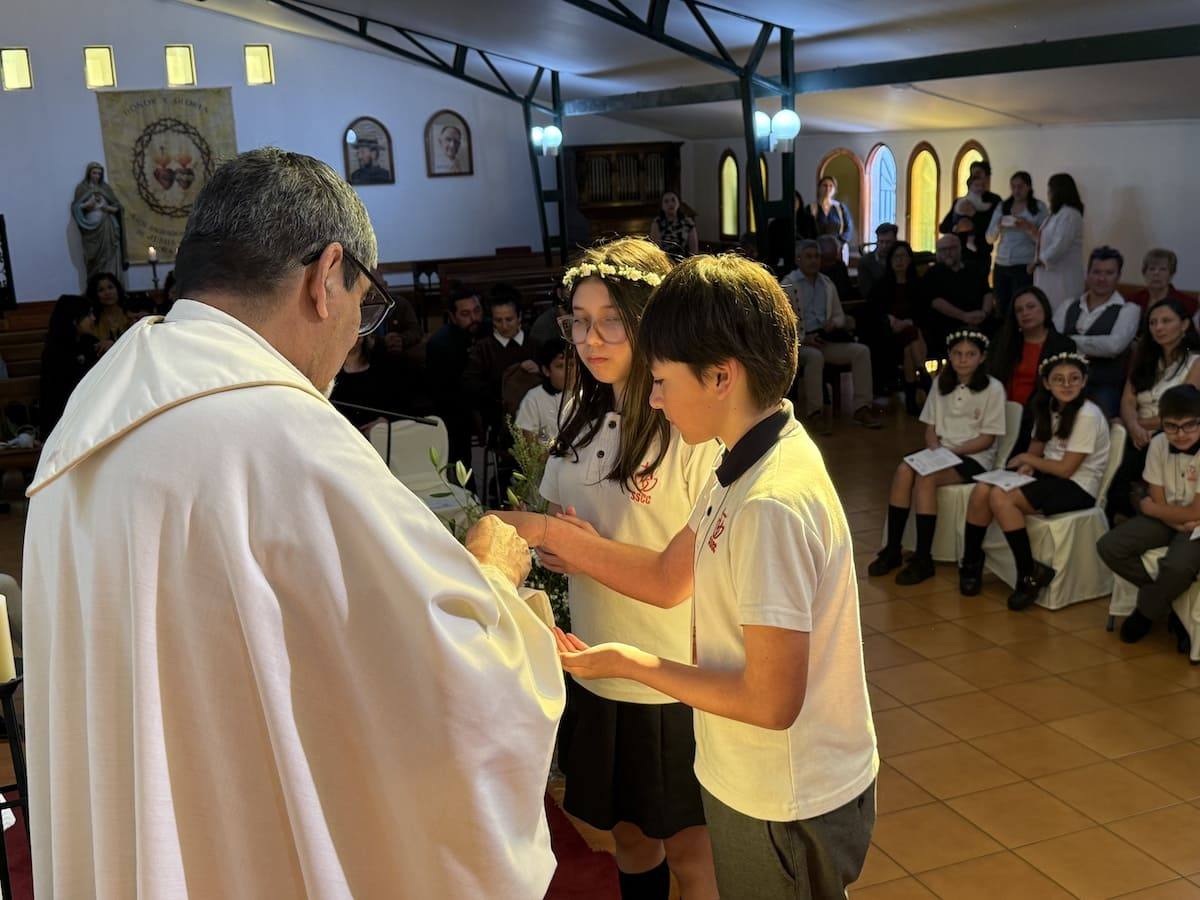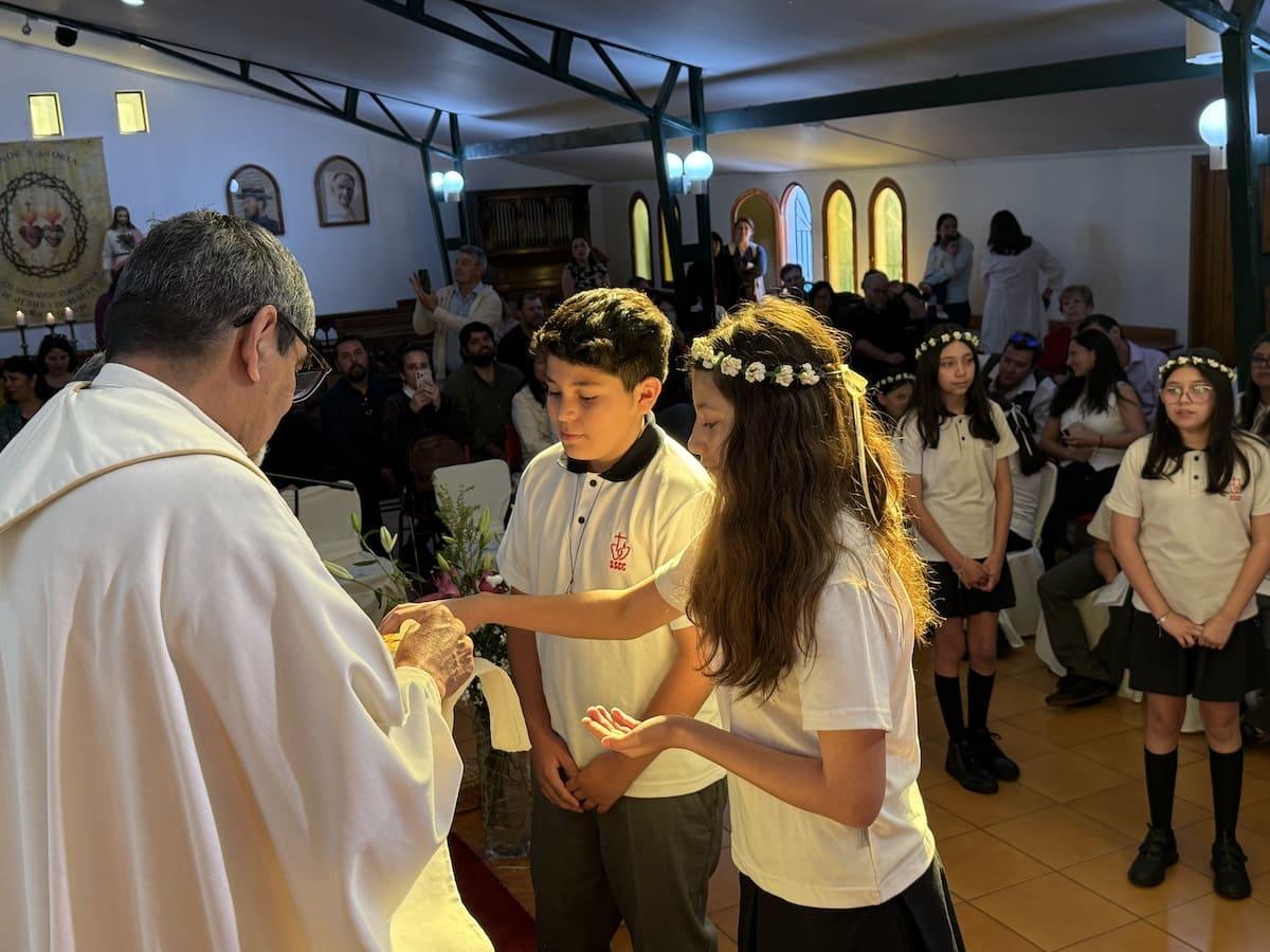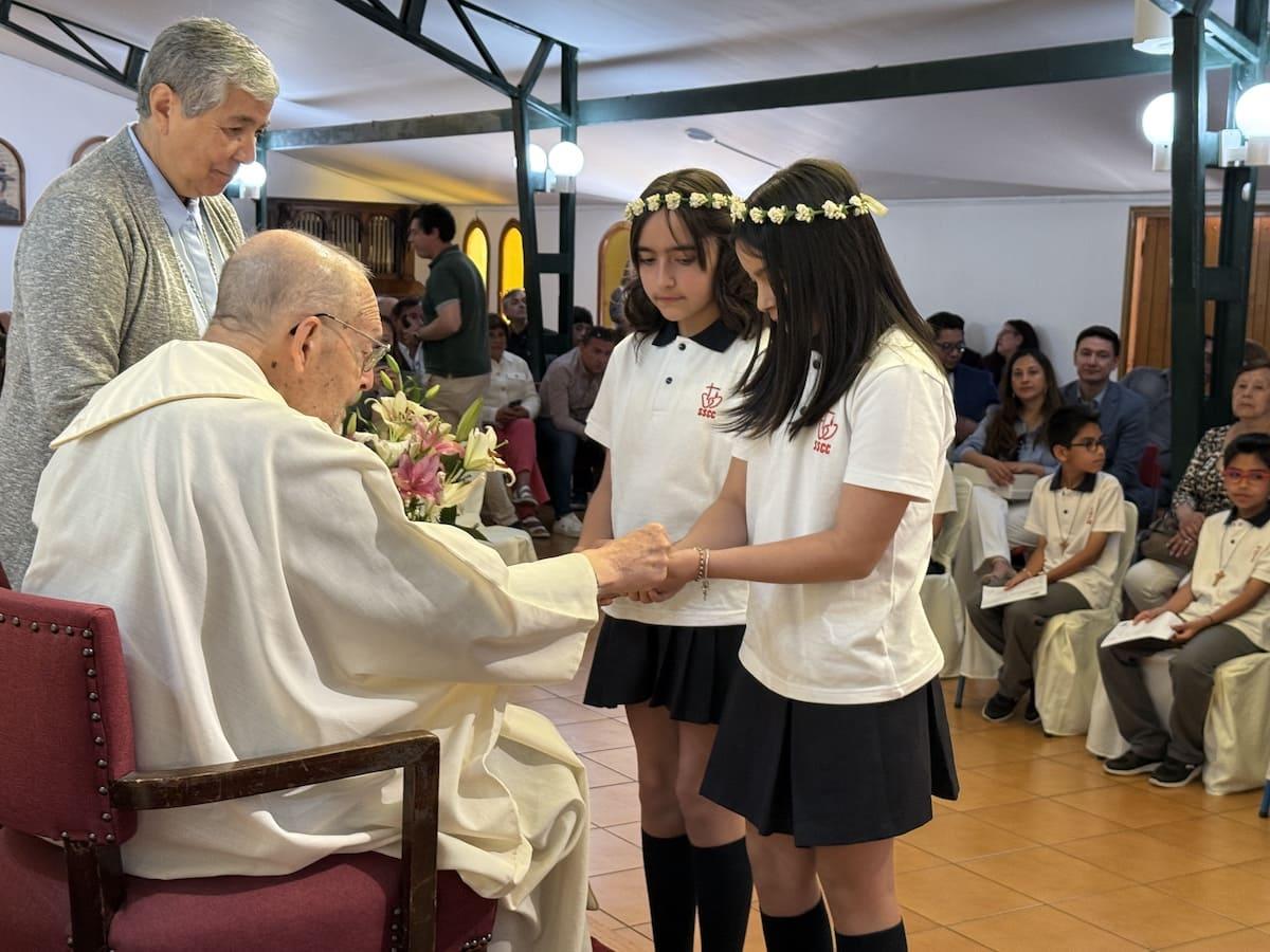 El sábado en la tarde fue el turno del 5º básico A y el domingo a las 9 de la mañana del 5º básico B. Ambas fueron presididas por el hermano Mario Soto ss.cc. quien mantuvo entusiasmados a los pequeños haciéndoles preguntas y conversando lo que significa la oración y el amor de Jesús en sus vidas.